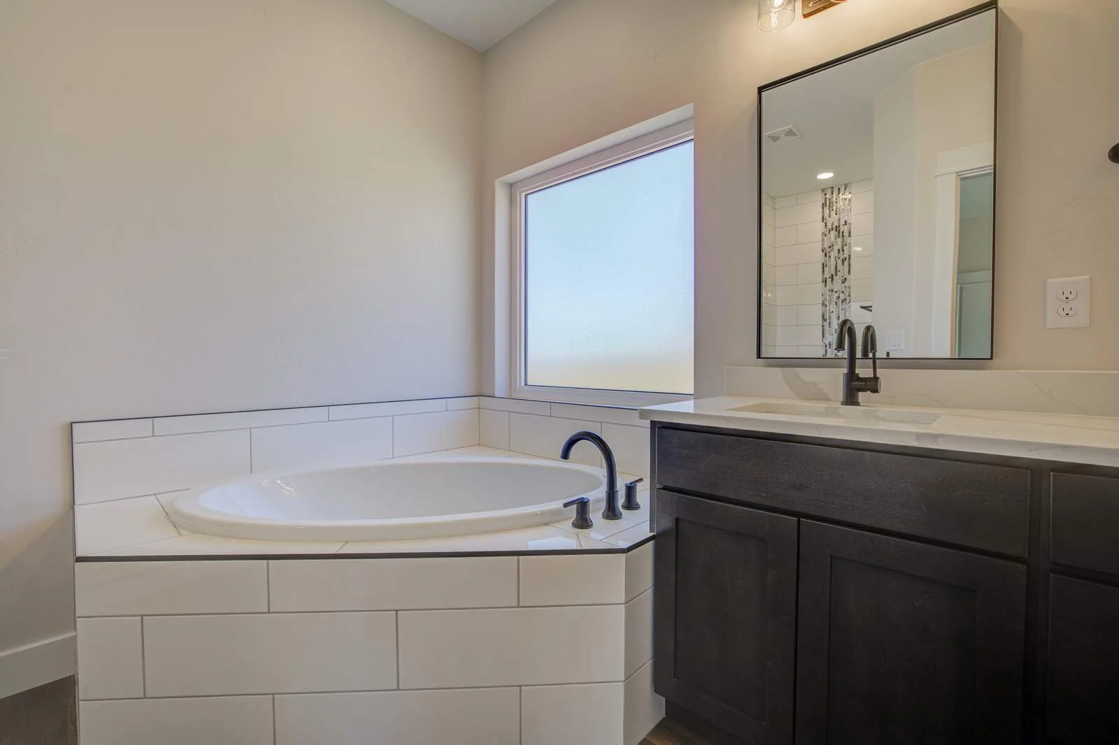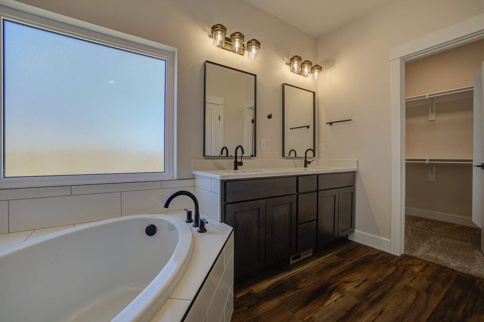 Luxury vinyl tile, tile, and carpet flooring throughout